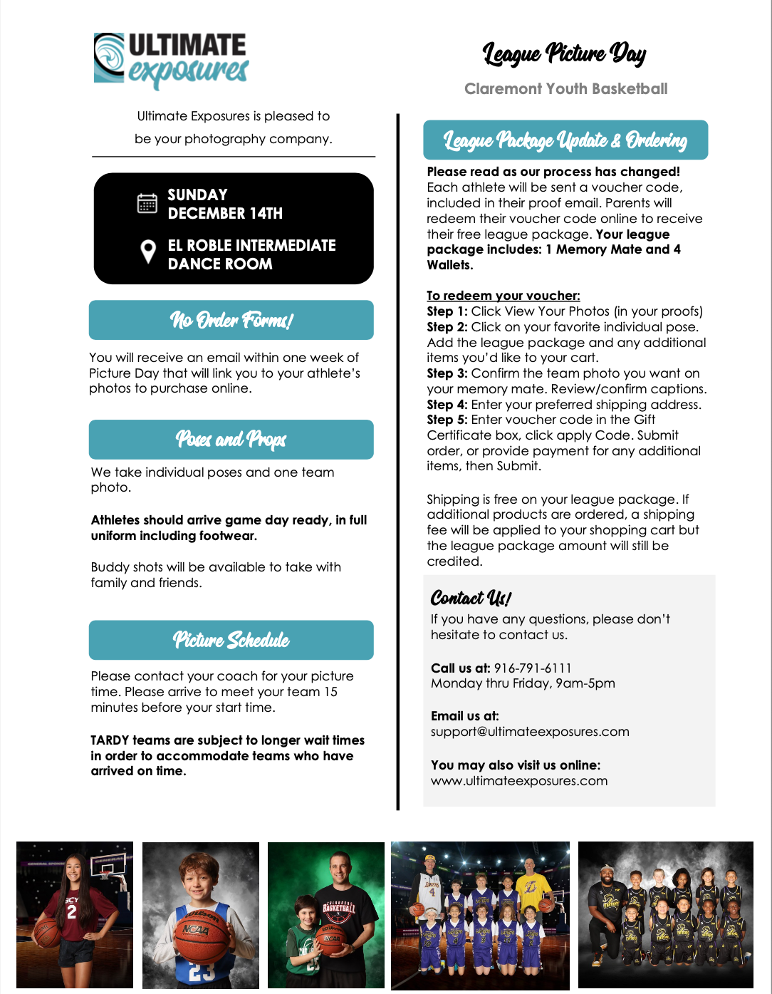 This year, our picture services will be provided by Ultimate Exposures (UE). UE is helping provide an amazing array of options for each family. Another change is that Picture Day will occur at El Roble Intermediate School's Dance Studio. Picture Day will no longer be at Claremont High School.